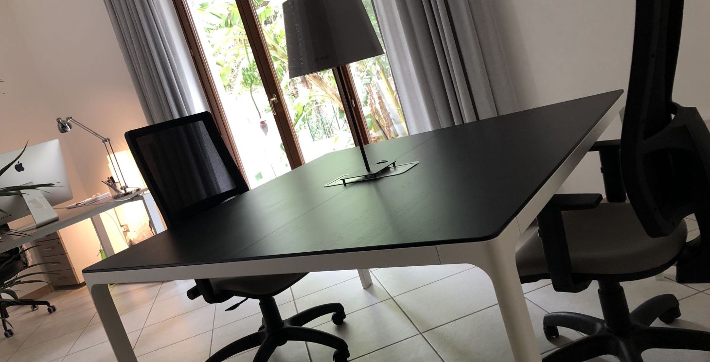 Sistemazione su un tavolo scrivania quadrato 140×140 (capienza tavolo scrivania: max di 4 persone).