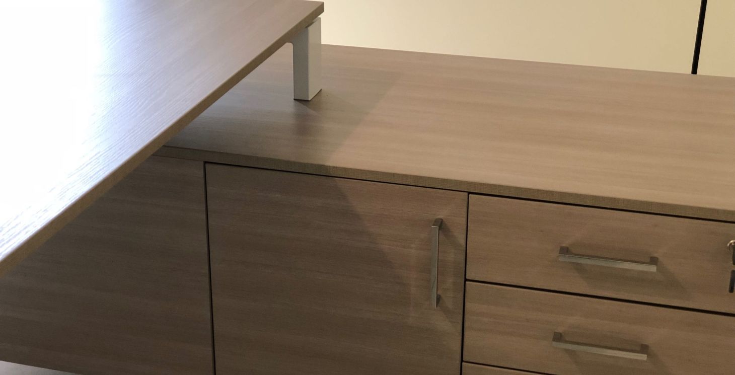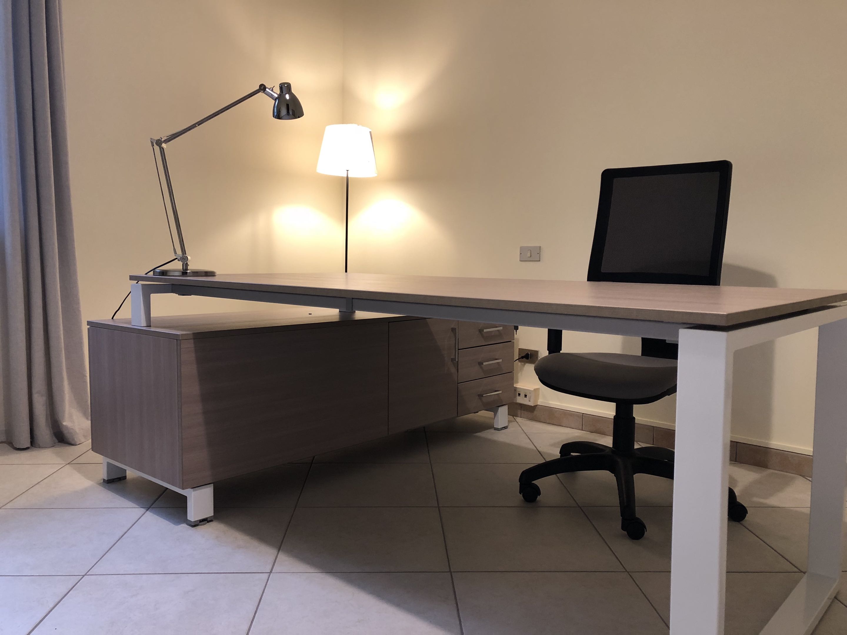 Stanza Ufficio indipendente attrezzata con 1 Scrivania direzionale 210×90 cm con mobile servente (lato destro) integrato. Seconda scrivania 140×80 cm (su richiesta)
